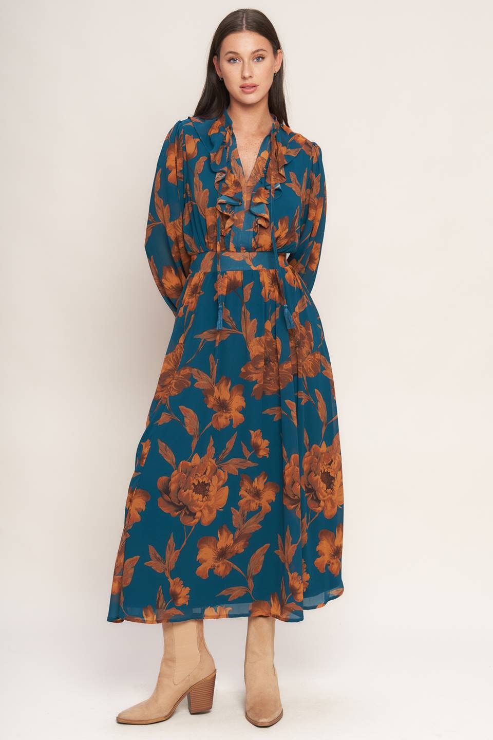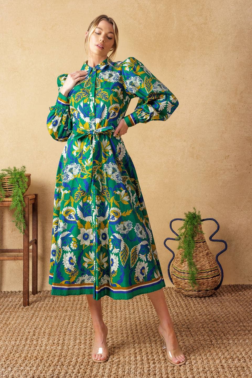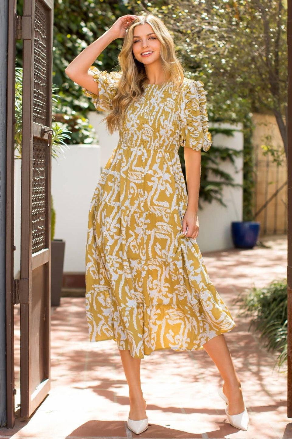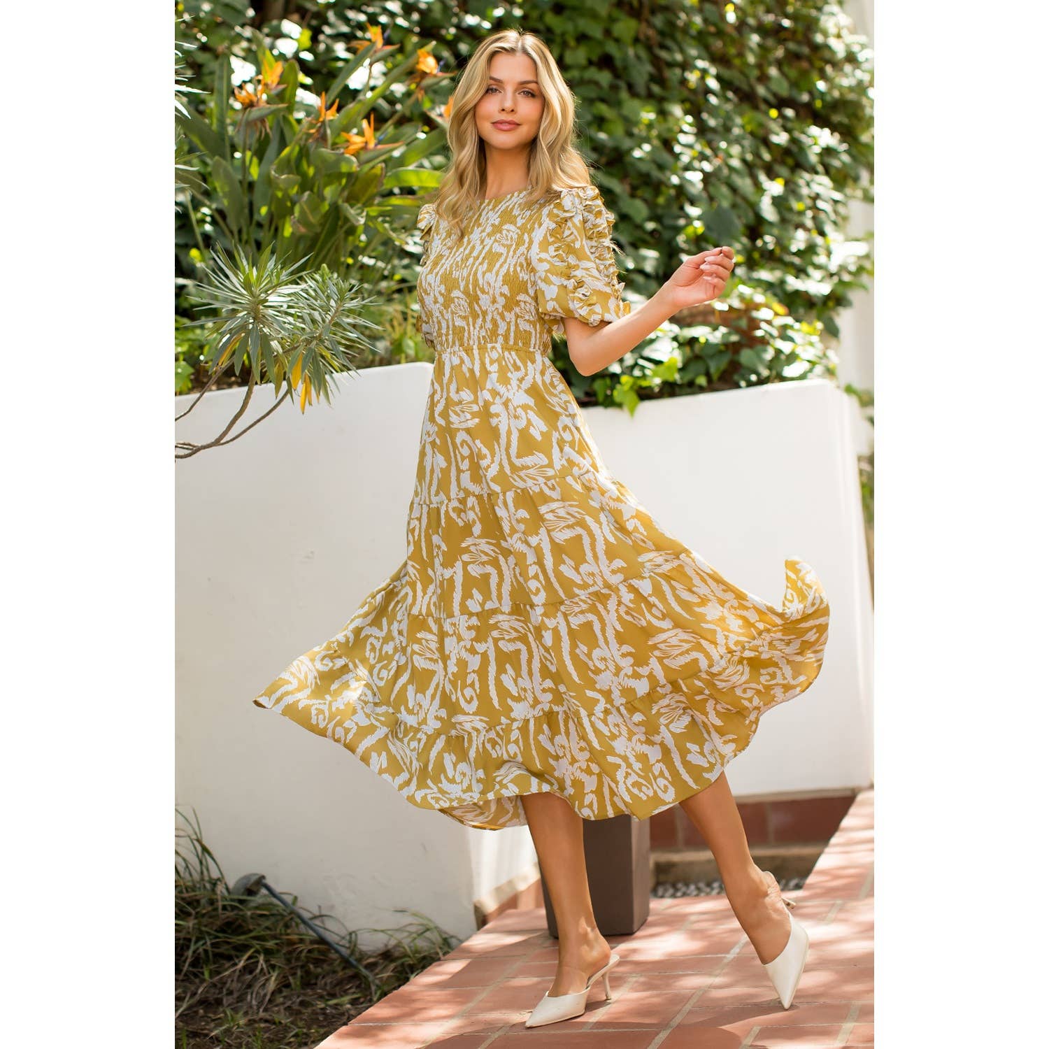 Smocked Puff Sleeve Print Maxi Dress - Mustard