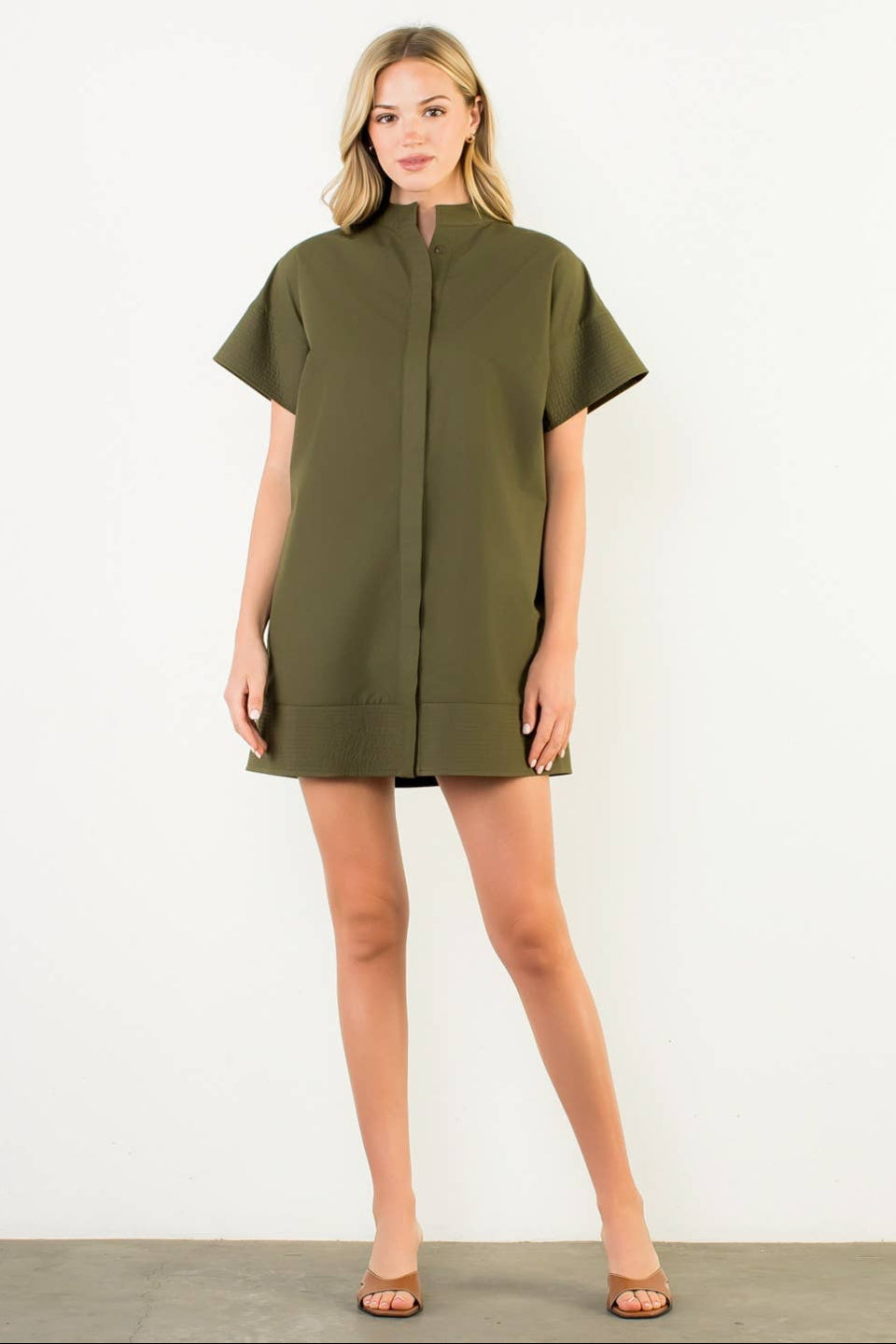 Striped Trim Short Sleeve Shirt Dress - Olive