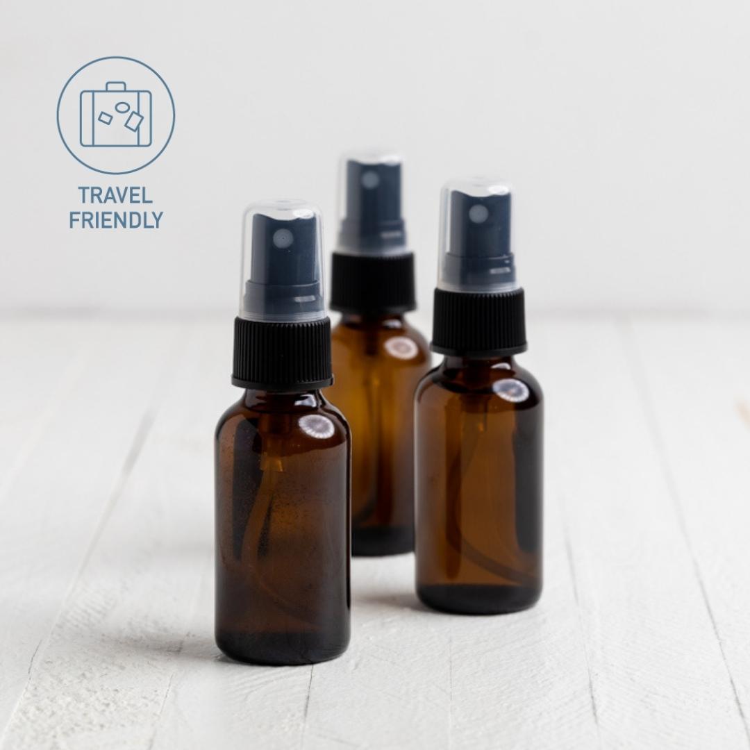 1 oz glass bottle with a sprayer or 4 oz glass jar with metal lid.