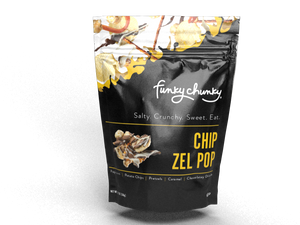 This delightful small bag is perfect for party favors, back-to-school gifts, hospitality bags and stocking stuffers. Each bag contains two servings. Eight (8) units in a tearaway case. Chip Zel Pop - The satisfying bite of salty chips and pretzels is the classic go-to snack. Combined with buttery caramel popcorn, thick swirls of caramel and three kinds of chocolatey drizzle.