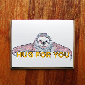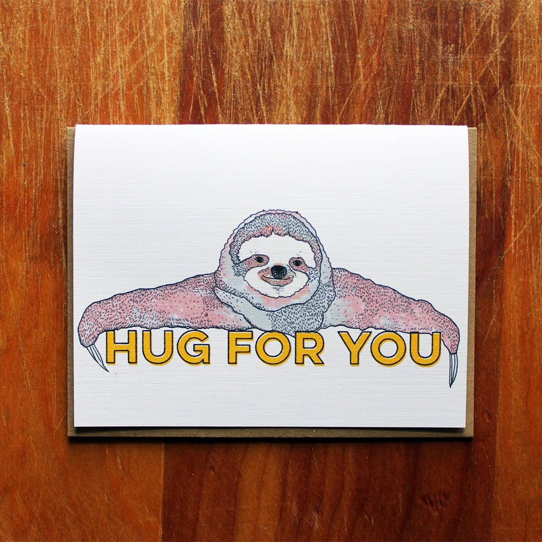 What to give to the person who has it all? A hug from a sloth! Hug for youuuuuuuu this card measures 4.25 X 5.5 When folded and comes with a 100% recycled brown bag envelope.
