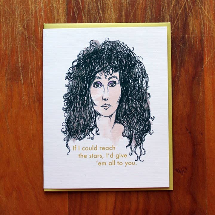 Remember when cher bounced around in that outfit that looked like it was made out of two seatbelts and several pairs of black pantyhose? And there were sailors. Lots of sailors. And these sweet words: "if I could reach the stars, I'd give em all to you." This card measures 4.25 X 5.5 When folded and comes with a 100% recycled brown bag envelope.