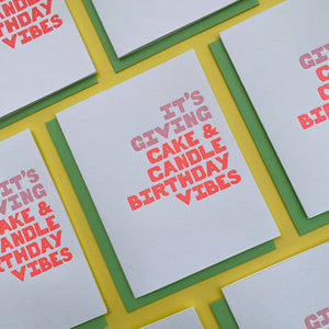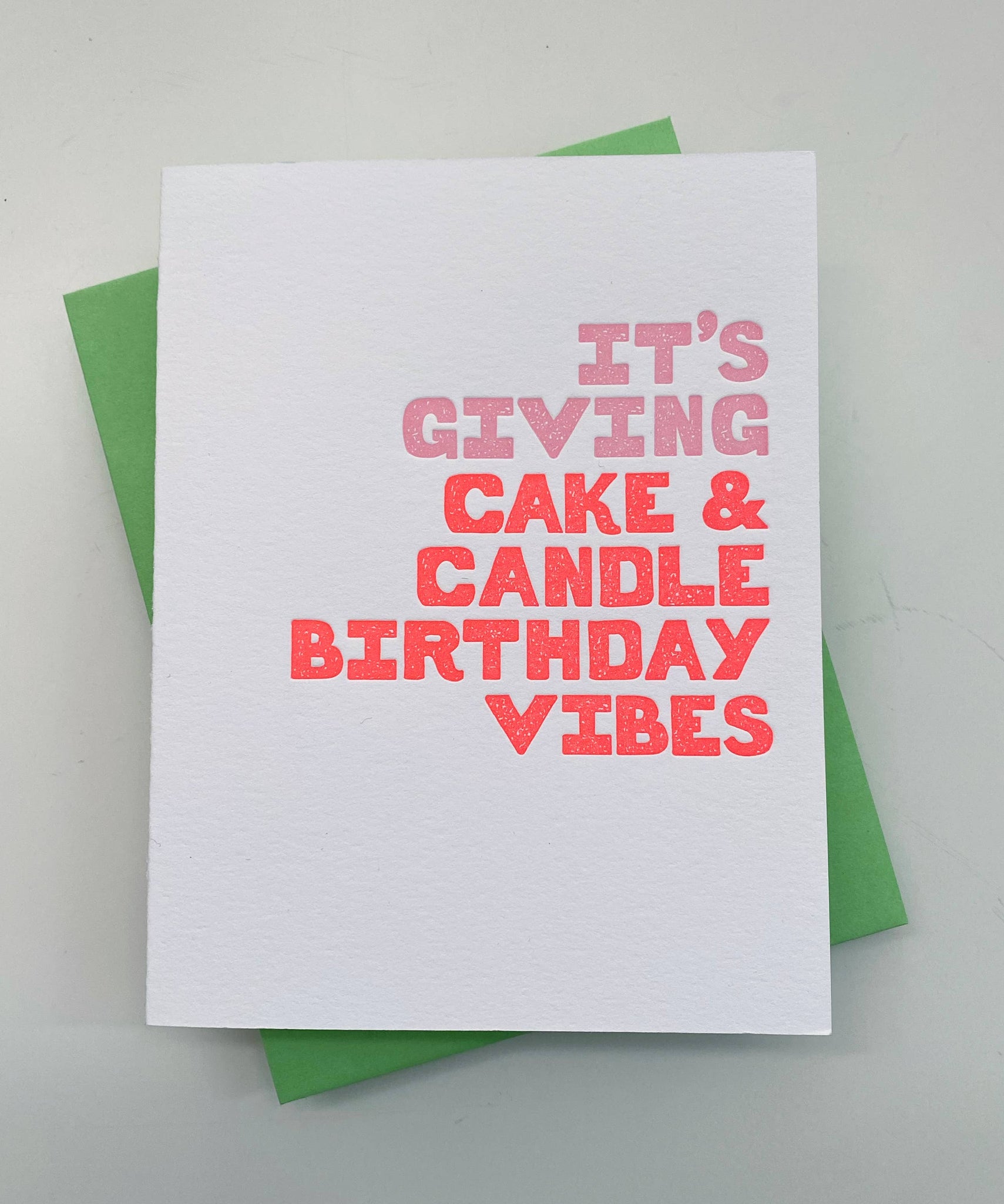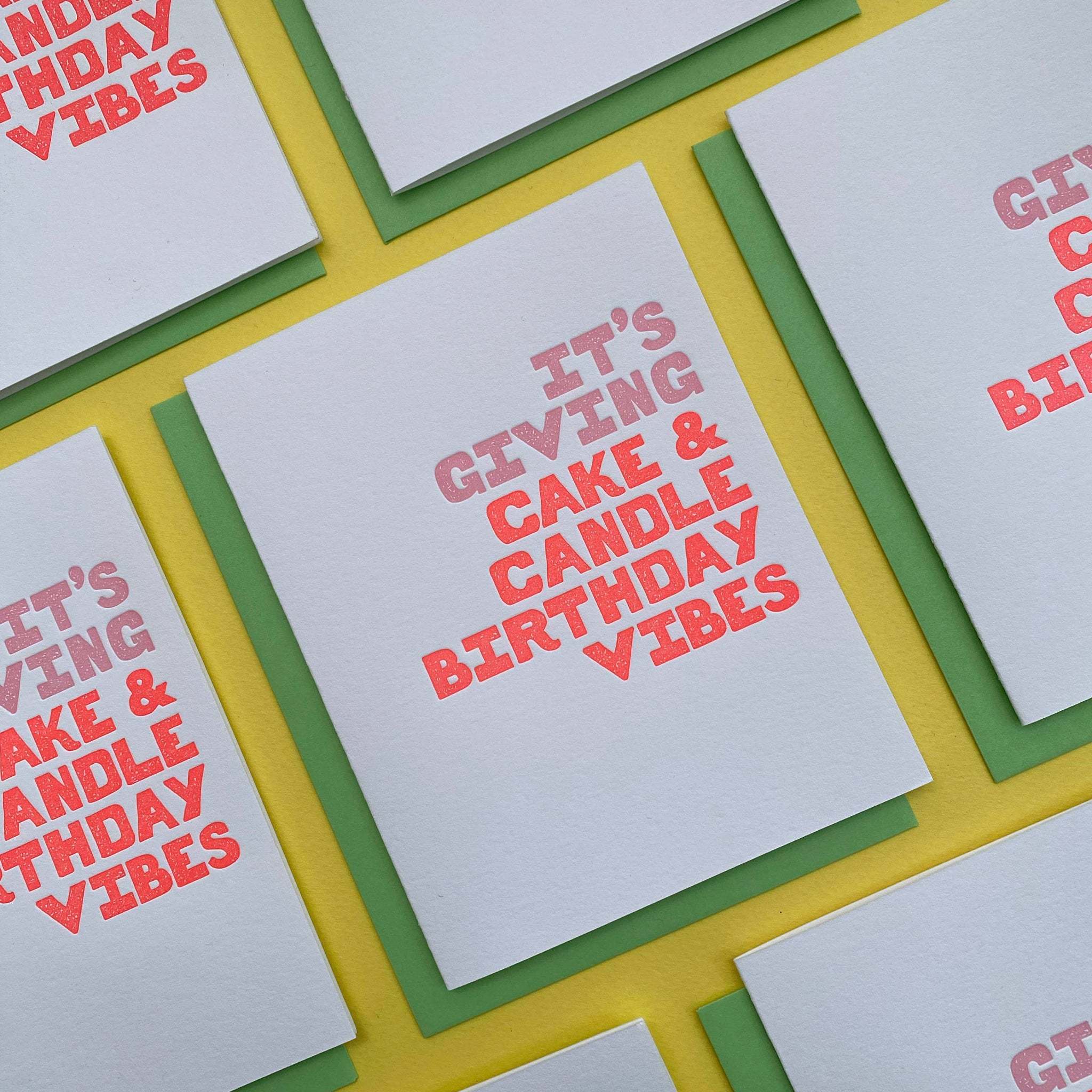 As the kids say these day IT'S GIVING... So It's giving Cake and Candle Birthday Vibes card is blank on the inside. 2 color Letterpressed greeting on Crane's Lettra cotton paper. Super lux to the touch. A2 4.25" x 5.5" hand printed in our Long Beach,CA Studio
