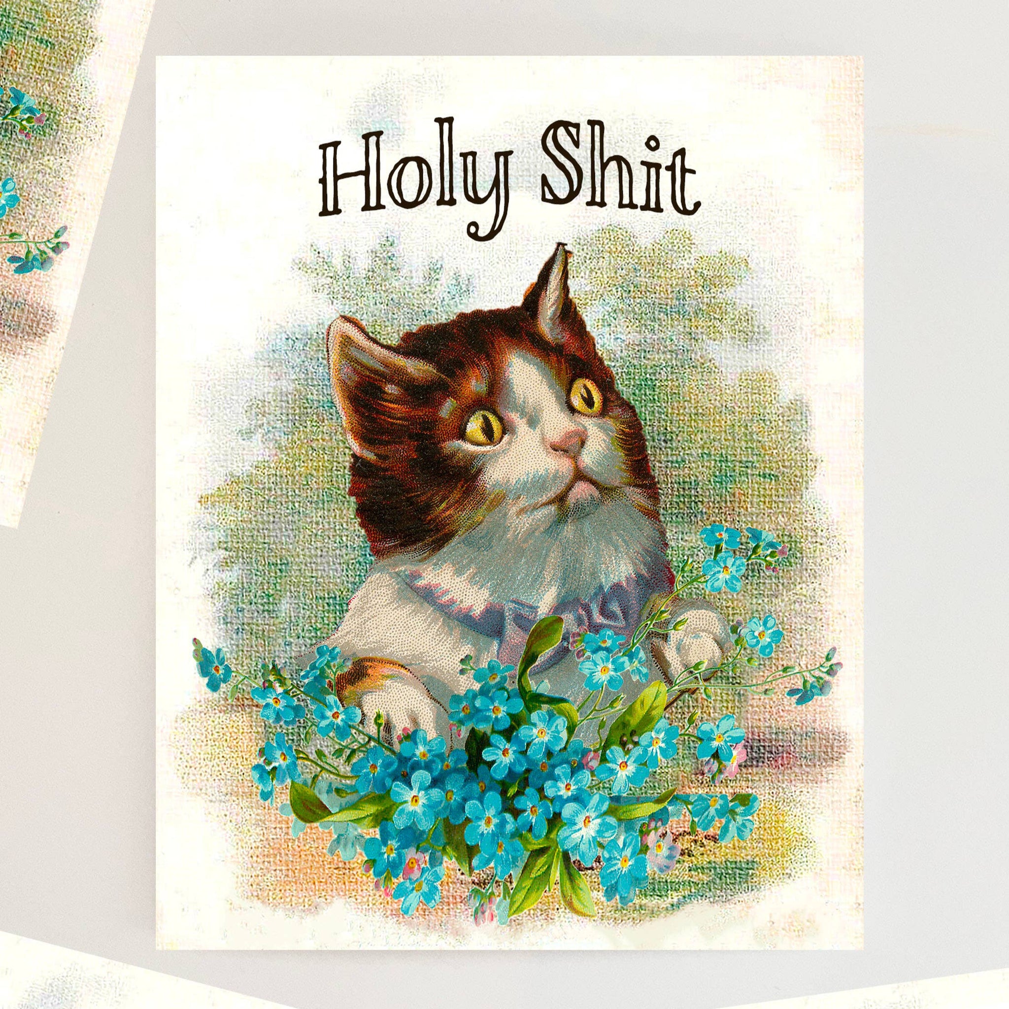 A nice "holy shit" really suits any occasion. A funny card for weddings, baby, new house, graduation, retirement, birthday, bar mitzvah, Christmas, we went to high school together and I stalked you on Instagram and found out your address...so many uses. You could even frame it! Holy Shit! Features a sweet little retro cat with flowers. Blank inside Printed on 130lb paper size A2 card measures 4.25"x5.5" Comes with envelope and protective cello sleeve.