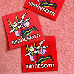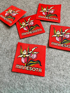 A woven sticker patch featuring the Minnesota state flower, the lady slipper. Meow! Backed with 3M double-sided adhesive backing, it's very sticky! The sticker can also be used as a patch, and is washable-but the adhesive is not. So you need to stitch the edges (or uses fabric glue) if you want to apply it clothing or any fabric you plan to launder:) 1.75" in x 1.75" in