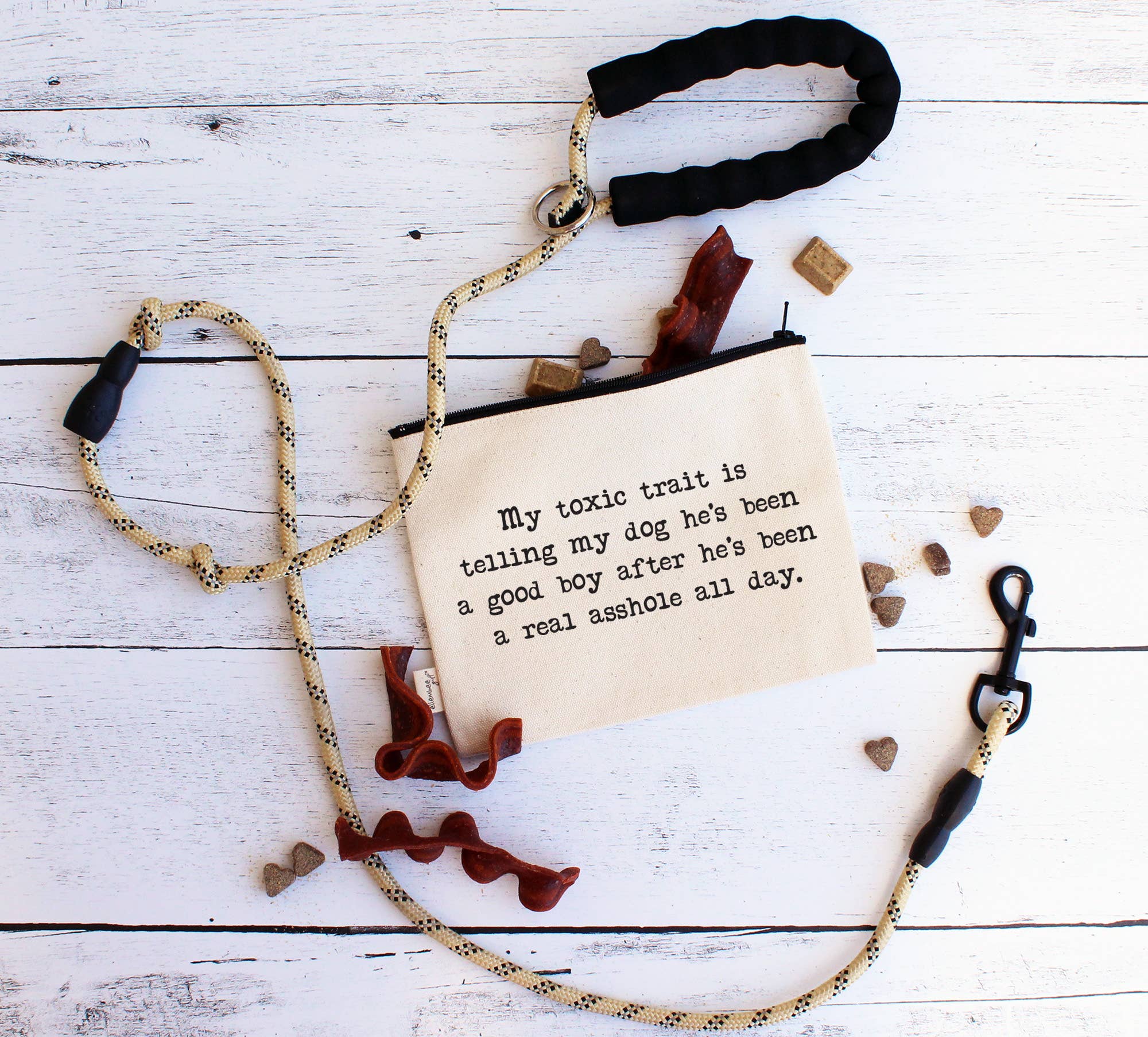 Our fun yet functional zipper pouches make the perfect gift! They're made of 100% durable cotton canvas, with a black YKK zipper. At 7.5" wide by 6" tall, they're the perfect size to throw in your bag! They're the perfect size for makeup, nail polish, coupons, spending money, receipts, office supplies, and so much more! The bag is sewn in China, and printed by hand in our Highland, MI warehouse, using an environmentally friendly, water-based ink. KEYWORDS: My toxic trait is telling my dog he's been a good boy after he's been a real asshole all day, zipper pouch, makeup bag, printed in usa, travel bag, travel size, sustainable, trending gift ideas, trendy, pouches, mask pouch, eco friendly, 100% cotton, ellenbee, ellembee, lnb, clever gifts for clever people, female made, funny busy mom gifts, funny gifts for friends, gifts for bff, funny gifts, Made in China, Printed in USA