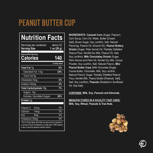 Large, re-sealable bags are the perfect size for stocking stuffers, back-to-school gifts, office gifts or having on hand for drop-in guests. Each bag contains five servings. Six (6) units per case. Peanut Butter Cup - Peanut butter and chocolate is an obvious heartbreaker, but we amped up that delight with swirls of peanut buttery and milk chocolatey drizzle. And peanuts. And caramel popcorn.