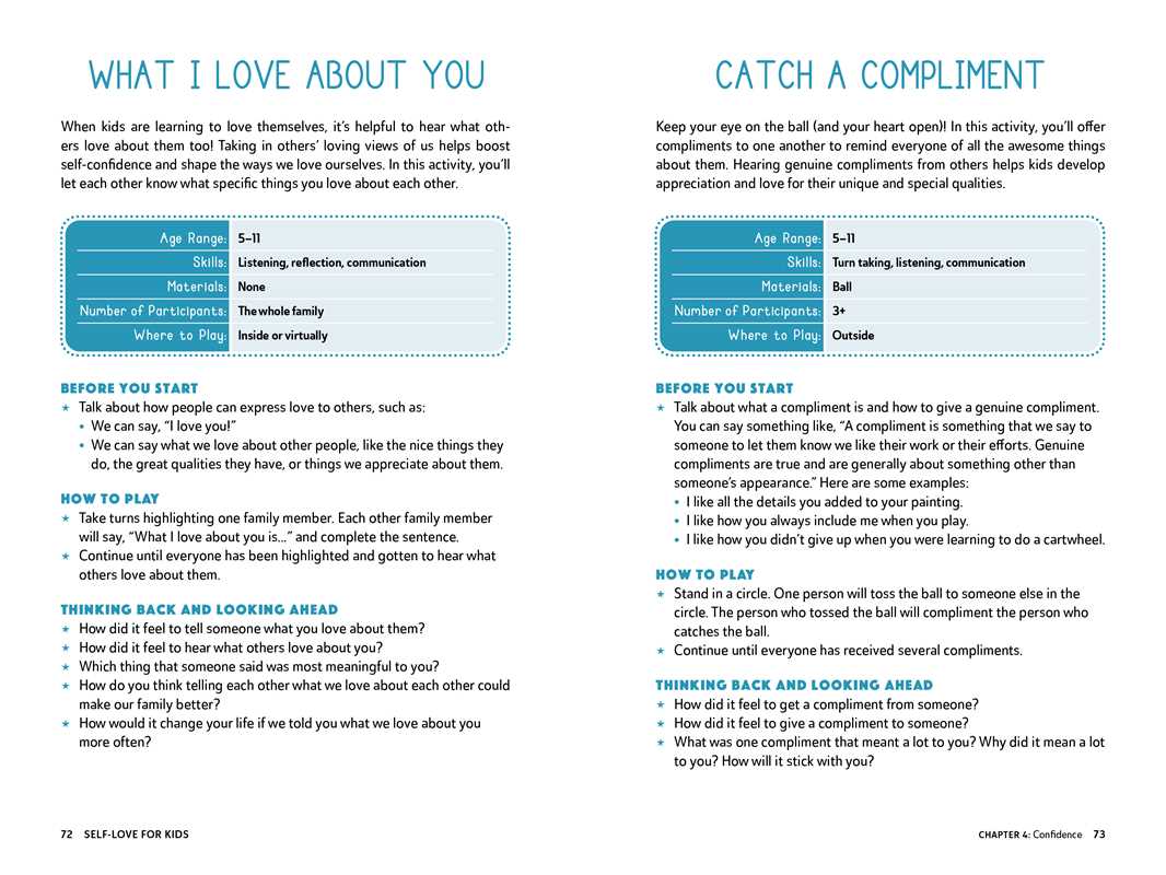 [Adams Media] Teach your kids to be confident, independent, and happy with over 150 easy, fun activities you can do with your children to encourage everything from body positivity to positive self-talk. It’s more important than ever to make sure your child develops a strong sense of self-love, even at a young age. But how do you make sure you’re building up their confidence while keeping them safe and exposing them to even greater challenges? Introduce some self-love into your daily routine with over 150 activities specifically designed to keep your child (and their friends) entertained, all while giving them a positive self-view. In Self-Love for Kids, you’ll learn everything you need to know about how self-love, self-esteem, and a growth mindset develop in children and what you can do to support that development. From there, you’ll find games for both a group setting and for some one-on-one time to encourage self-love, such as asking your child to share what they are most p