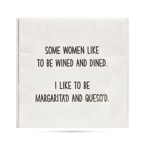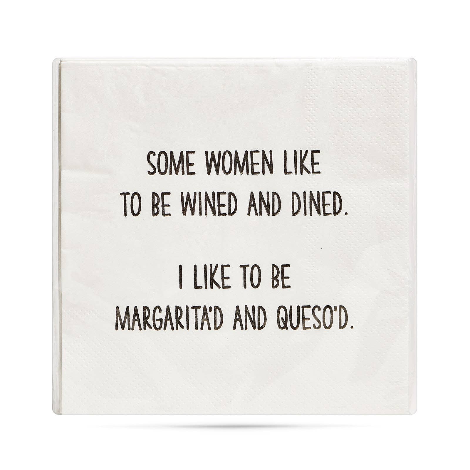 Our 3-ply, 5x5 folded, white napkins are printed with crisp black ink. They come cellophane wrapped in packs of 20, and we think they're some of the funniest on the market! (If we do say ourselves.) Why not add a little sass to your next cocktail party?! They even make a great hostess gift with a bottle of wine! KEYWORDS: Some women like to be wined and dined I like to be margarita'd and queso'd Cocktail Napkins, margaritas, queso, margs, tequila, queso lover, taco tuesday, cinco de mayo, wine lover, wineo, cocktailing, drinking with friends, girls night, hostess gifts, hosting parties, kitchen gifts for entertaining, kitchen accessories, bar decor, entertaining, bff gifts, funny cocktail napkins, girls night, bestie gifts, printed napkins, napkins, funny sayings, snarky gifts, best birthday gifts, gifts for coworkers, disposable napkins, sassy napkins, snarky napkins