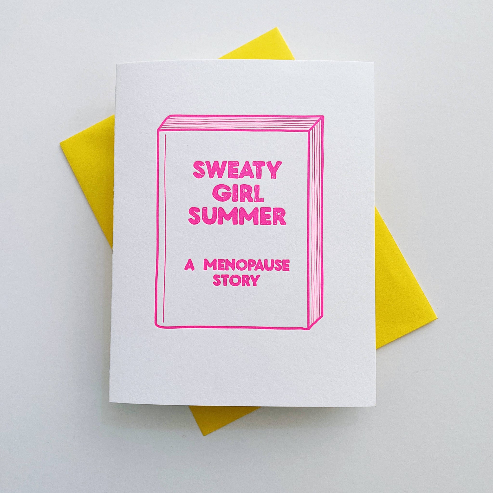 You've got Hot Girl Summer but have you seen Sweaty Girl Summer? It's not pretty! Makeup smears, fans come out, faces turn red....Our new collection poking fun at menopause is sure to make the ladies laugh. Letterpress printed with neon pink ink A2 greeting / blank inside packaged with a cello sleeve neon birthday card, hot girl summer, 50th birthday gifts, for women, funny birthday card, for best friend, rude birthday card, sister birthday card, menopause card, letterpress cards, best friend gifts, best friend cards, thinking of you card