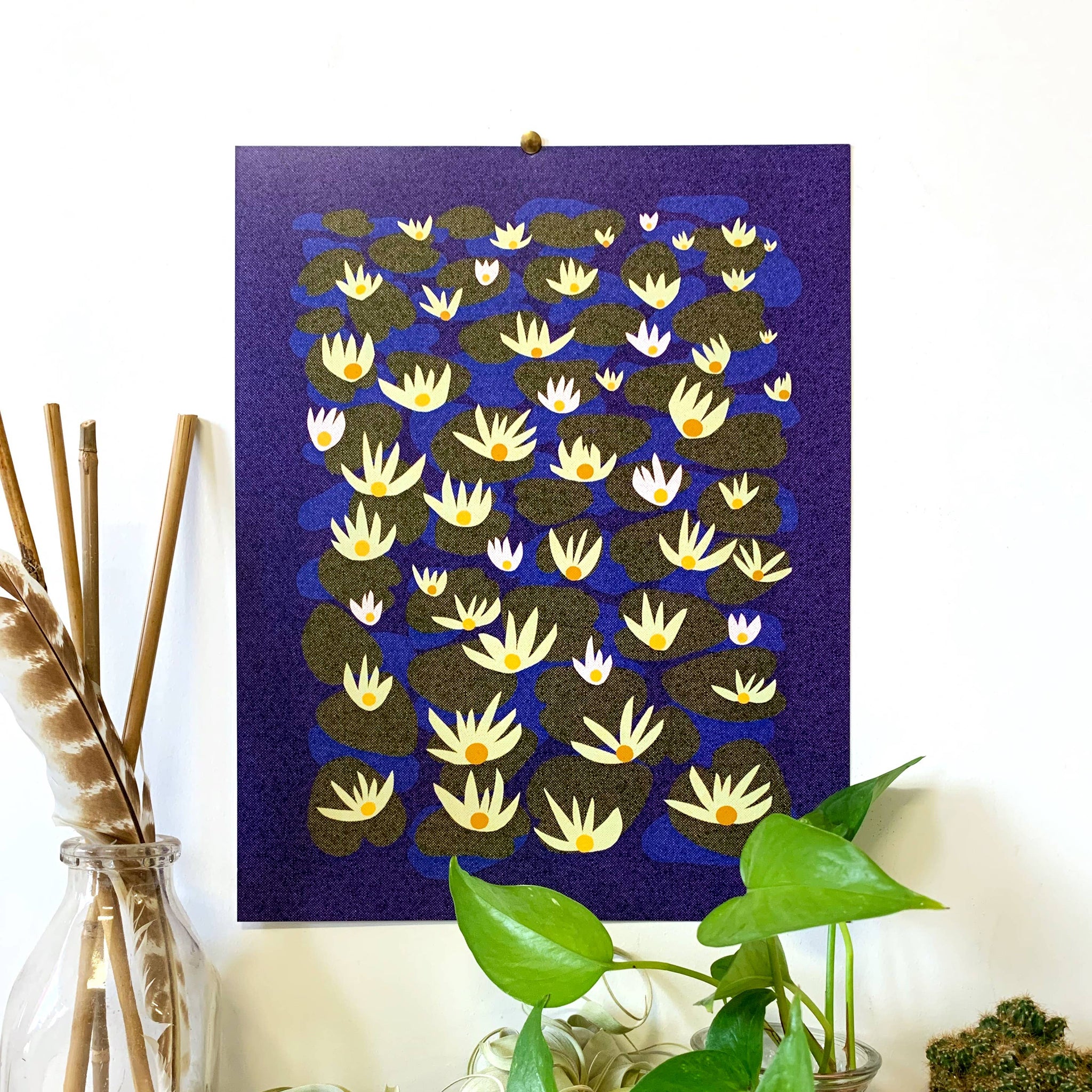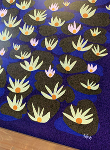 Water Lillies. I saw some on a lake, in the summer. I drew them up and there you have it. Decor! This is an 11 x 14 borderless print on epson ultra premium presentation paper in matte finish. It will come to you in a plastic sleeve and safely packed flat in a rigid cardboard mailer:)