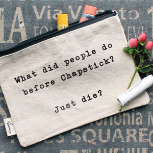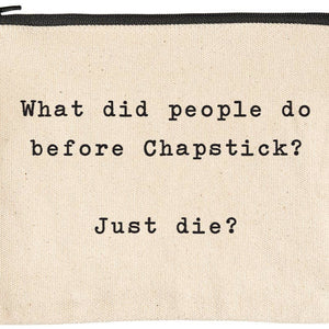 Our fun yet functional zipper pouches make the perfect gift! They're made of 100% durable cotton canvas, with a black YKK zipper. At 7.5" wide by 6" tall, they're the perfect size to throw in your bag! They're the perfect size for makeup, nail polish, coupons, spending money, receipts, office supplies, and so much more! The bag is sewn in China, and printed by hand in our Highland, MI warehouse, using an environmentally friendly, water-based ink. KEYWORDS: What did people do before Chapstick? Just die? zipper pouch, makeup bag, stocking stuffers, printed in usa, travel bag, travel size, sustainable, trending gift ideas, trendy, pouches, mask pouch, eco friendly, 100% cotton, ellenbee, ellembee, lnb, clever gifts for clever people, female made, funny busy mom gifts, best selling makeup bags, best sellers, makeup pouches, gift for chapstick lovers, gift for burts bees lovers, best selling gift items under $10 Made in China, Printed in USA
